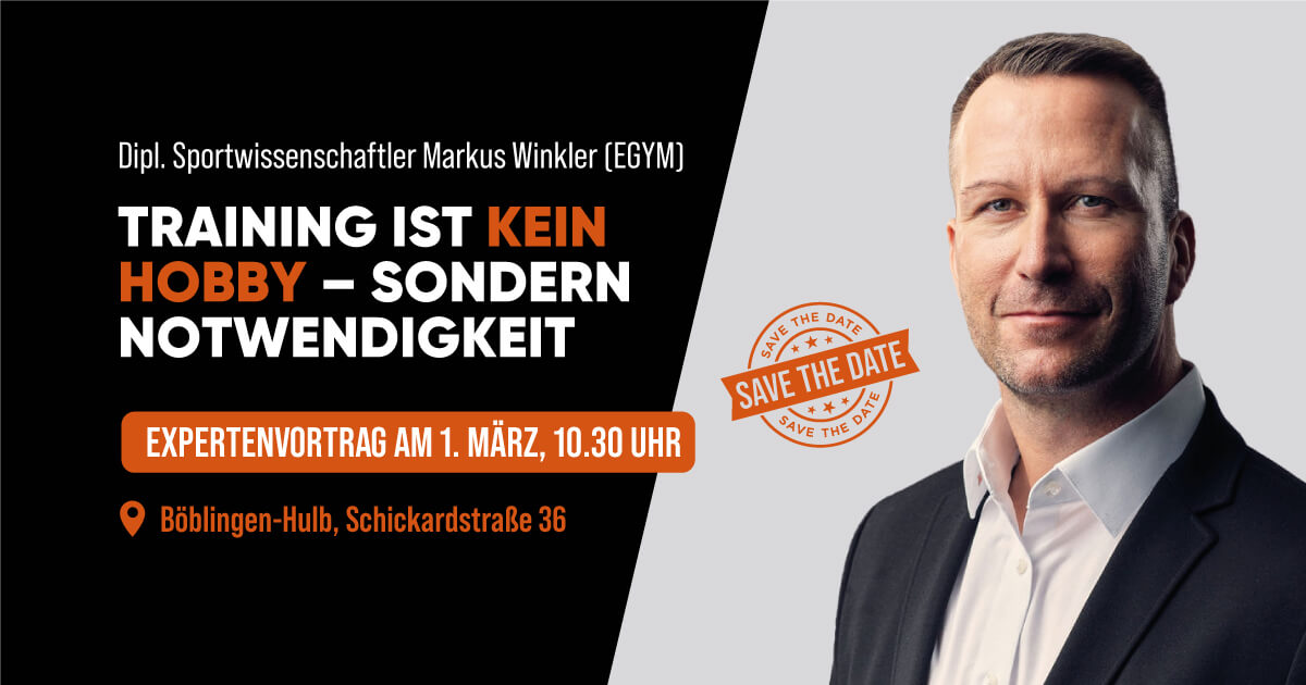 „Training ist kein Hobby, sondern Notwendigkeit“ – unter diesem Titel hält Markus Winkler, Dipl. Sportwissenschaftler und Experte bei EGYM, am 1. März von 10:30 bis 11:30 Uhr einen spannenden Fachvortrag bei uns im GYM-24 Böblingen-Hulb.